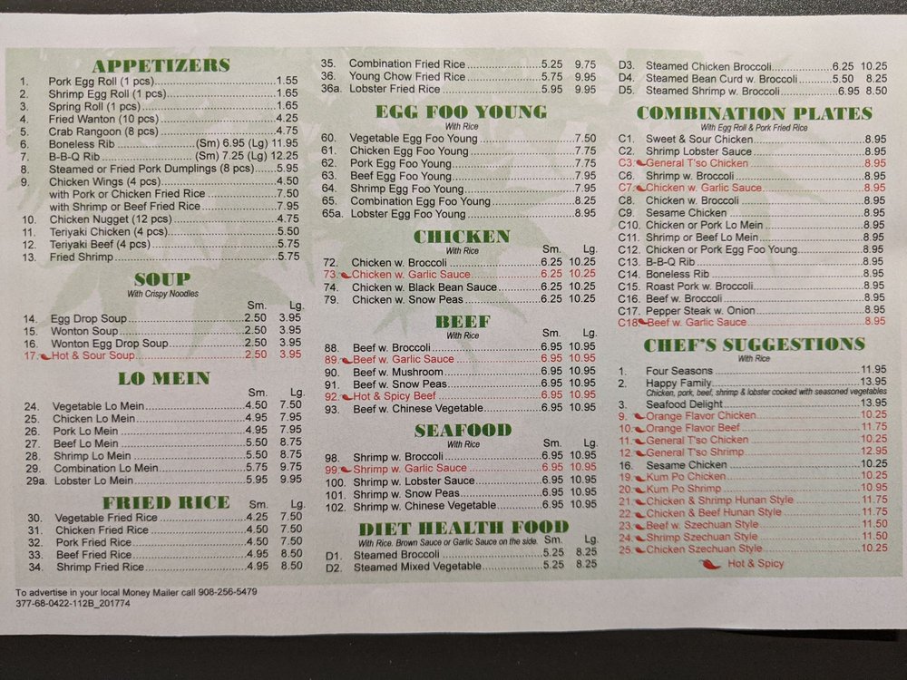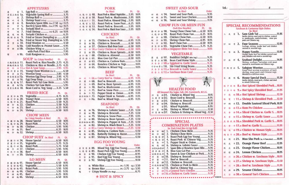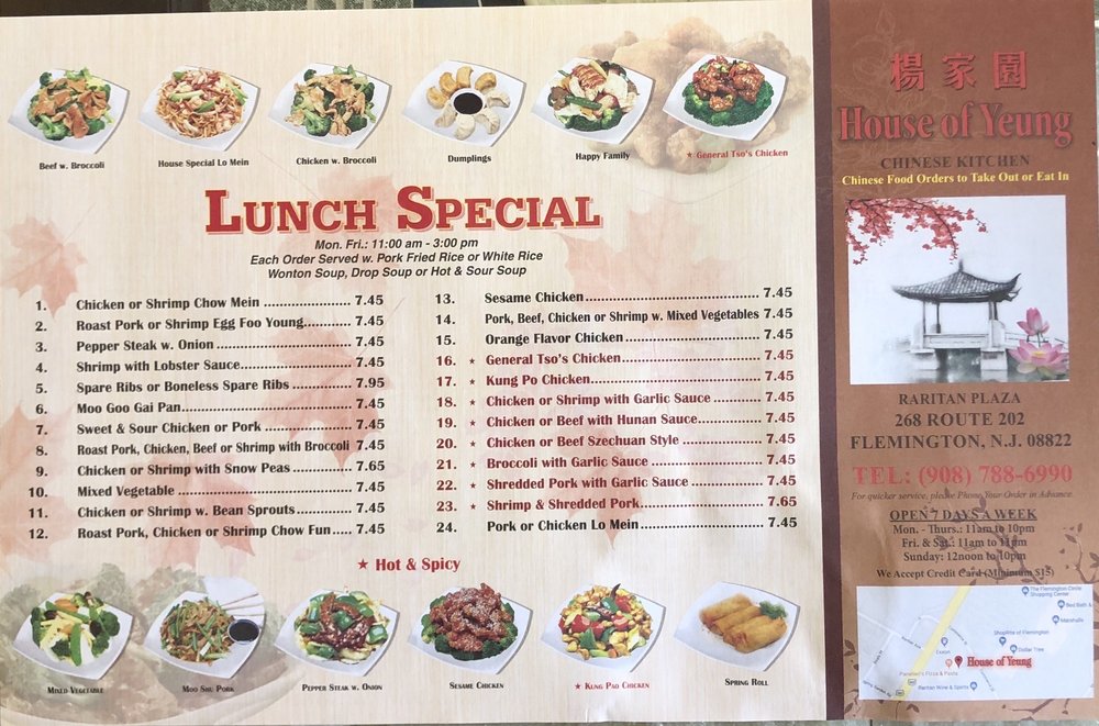 Introducing the menu at House of Yeung, a Chinese restaurant in Flemington, NJ, offering a variety of options for both dine-in and takeout. With a menu featuring classics like Egg Rolls, Chicken with Snow Peas, and Roast Pork Soup, there is something for everyone to enjoy. Customers rave about the General Tso's chicken and the flavorful wok dishes. The service is quick and efficient, making it a convenient choice for a delicious meal. Despite some mixed reviews on the pork dishes, overall, House of Yeung seems to deliver quality food consistently. Whether you're looking for a quick bite or a sit-down meal, this restaurant has something for every palate. Experience the tasty and fresh flavors at House of Yeung today.
